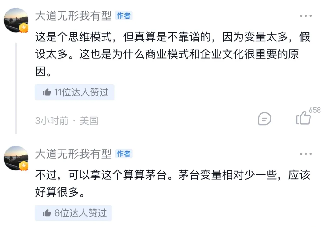 对此,段永平的回复是这样的:(自由现金流贴现)这是个思维模式,但真算是不靠谱的,因为变量太多,假设太多。这也是为什么商业模式和企业文化很重要的原因。