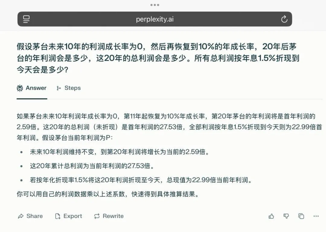 不过,虽然段永平认为现金流贴现变量太多,但是他依然强调:可以拿这个算算茅台。茅台变量相对少一些,应该好算很多。并表示,用比较保守的想法让ai算了一下。