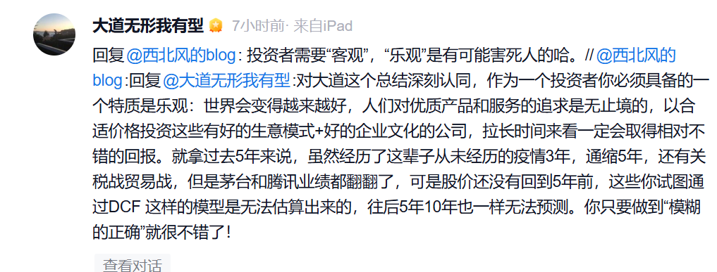 段永平进一步指出,相比纠结于折现率,更关键的是准确预测茅台在未来究竟能赚多少钱才是关键。不然不切实际的现金流预测,即使折现率再精确,估值的意义也并不大。他强调,投资者需要“客观”,“乐观”是有可能害死人的哈。
